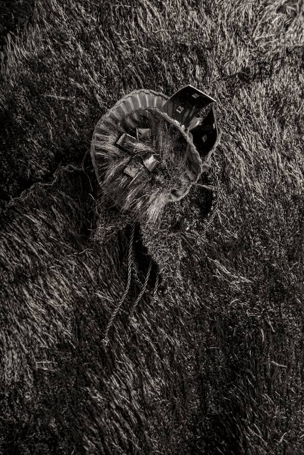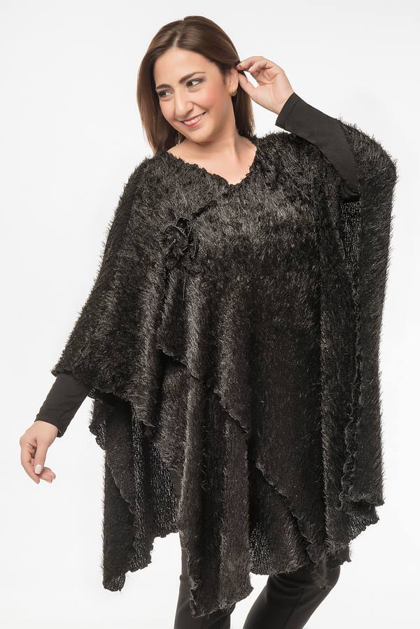 Poncho realizado en tela de punto con pelo, con broche realizado a mano que cierra en el cruce.