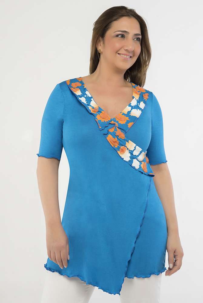 Remera cruzada realizada en modal con cuello estampado y aplicado a mano en muselina.